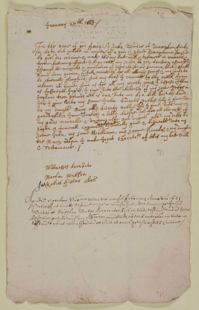 Let us begin with the will of John Winder of Dearham in the County of Cumberland, who left a will dated 1663. He also appears in the Dearham Bishop’s Transcript’s first entries, to survive, beginning in 1663. “John Winder of Dearham was buryed Jan 29th”. The parish registers before this date and going back to the 14th century are missing.